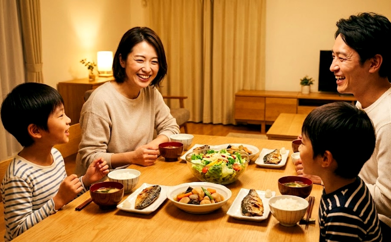 家族と一緒に食卓を囲み、
